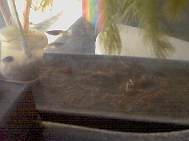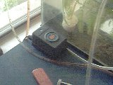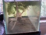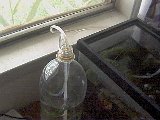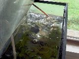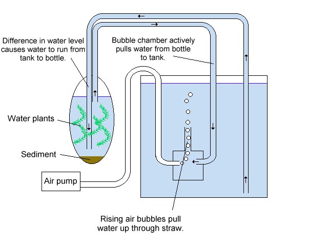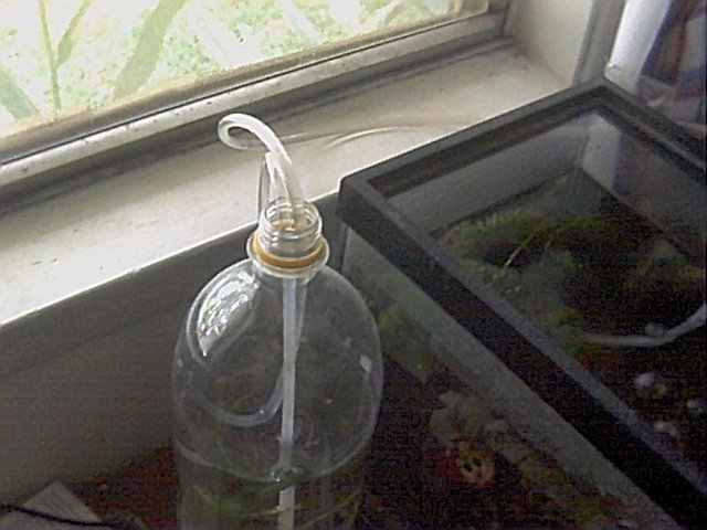 Here is a picture of the whole setup, showing the fishtank, the settling bottle and the air pump. |