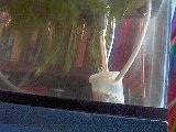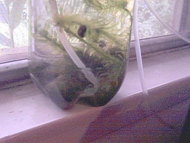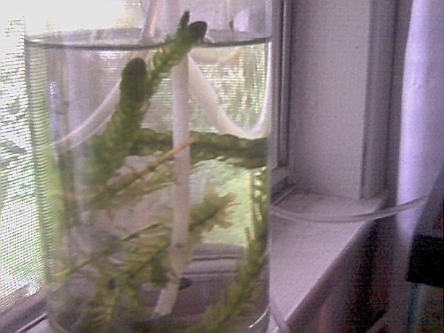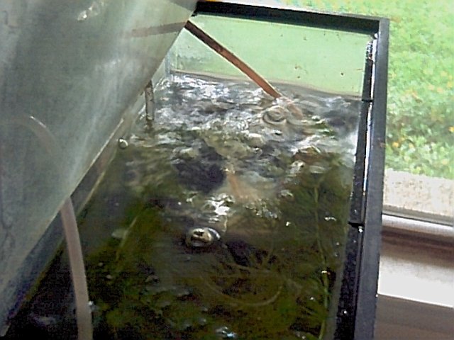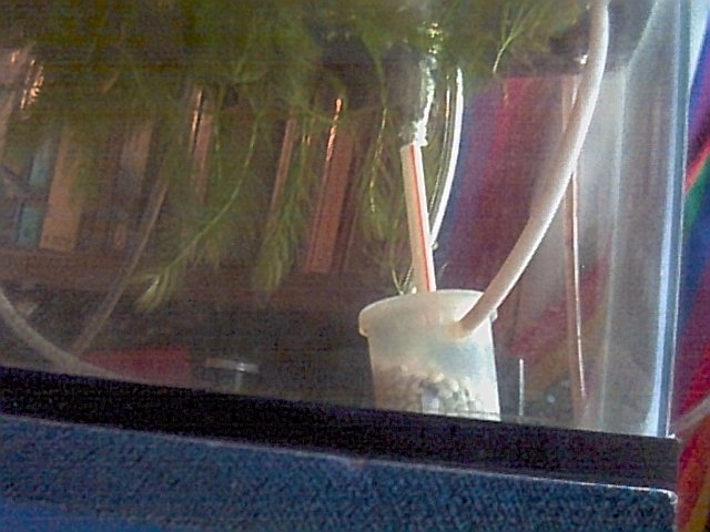 This is a picture of the bubble chamber. There are rocks in the bottom of the bubble chamber for ballast. You can see the air coming out of the top of the straw. |