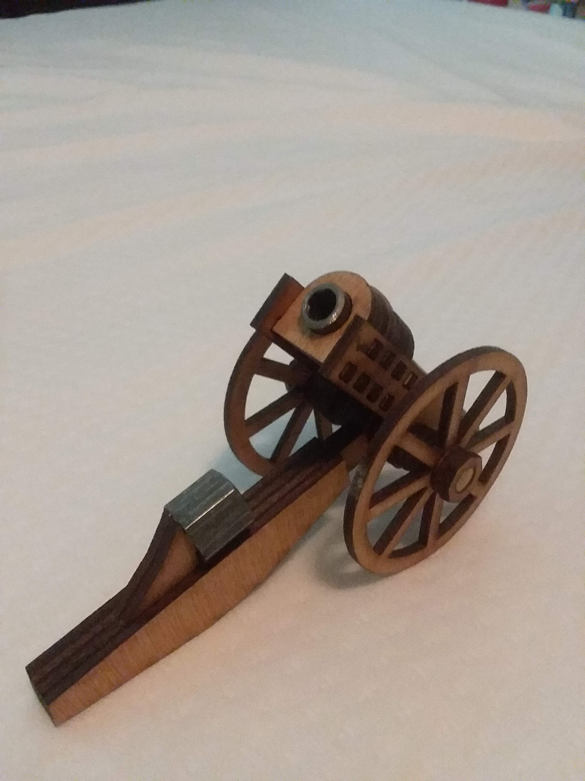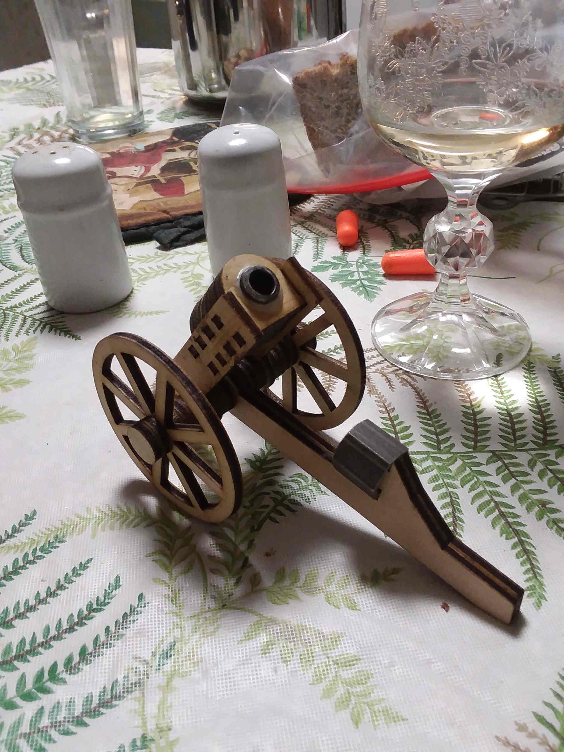 A long time ago I did a project to make a firecracker cannon. The point of that project was that I could get all the parts at a home supply store. However, there were some things I did not like about that cannon. Specifically, it was a real pain to reload because you had to unscrew the endcap to reload. Also, the threads of the endcap would get fouled with residue from the firecrackers. The plywood pieces are all cut from 2.7 mm plywood and were all cut on my laser cutter.